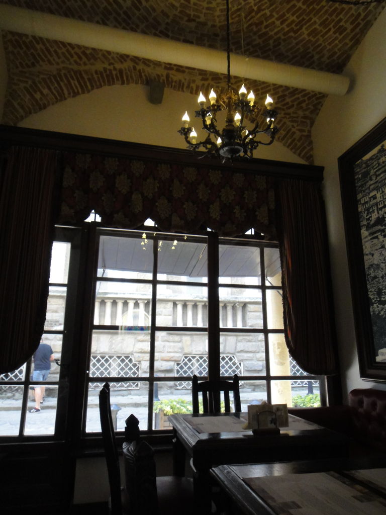 古い建物のレストラン。漆黒の机や椅子がいい。